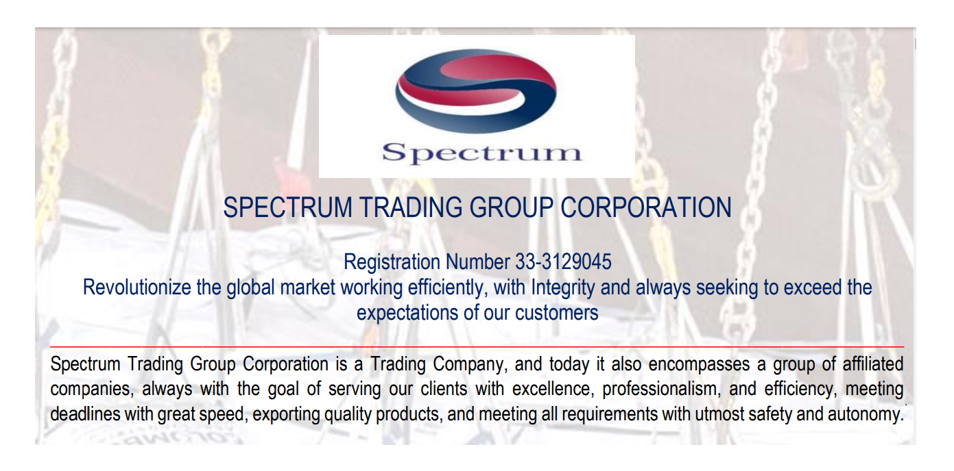 A Spectrum Trading Group Corporation se dedica a oferecer produtos de alta qualidade, seguindo rigorosos padrões internacionais. Com mais de 30 anos de experiência, nossa história reflete compromisso, valores sólidos e uma visão orientada ao crescimento sustentável.